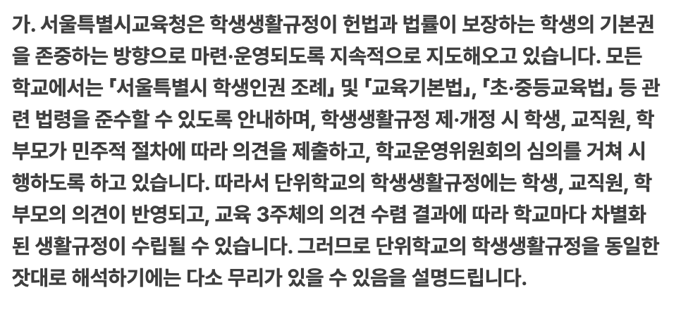 서울특별시서부교육지원청은 지난 23일 <토끼풀>이 인권침해적 학생생활규정에 대해 제기한 국민신문고 민원에 대해 보내온 답변서에서 “단위학교의 학생생활규정에는 학생·교직원·학부모의 의견이 반영되기 때문에 학교마다 차별화된 학생생활규정이 수립될 수 있다”며 “단위학교의 학생생활규정을 동일한 잣대로 해석하기에는 다소 무리가 있다”고 했다. 아무리 ‘차별화’라고 하더라도 명백히 헌법과 상위법·조례 위반인 학생생활규정을 합리화하는 것은 옳지 않다는 지적이 예상된다.